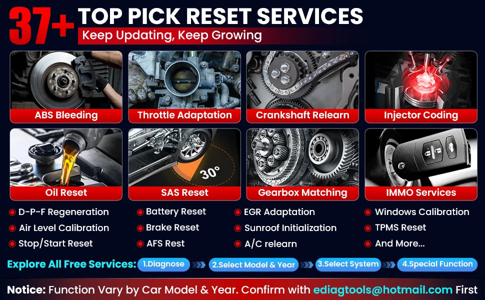 - 60+ hooldusfunktsiooni: Hõlmab levinud teenuseid, nagu õlivahetuse nullimine, ABS õhutamine, TPMS programmeerimine, DPF regeneratsioon, SAS kalibreerimine, akude registreerimine, IMMO võtme programmeerimine ja palju muud.